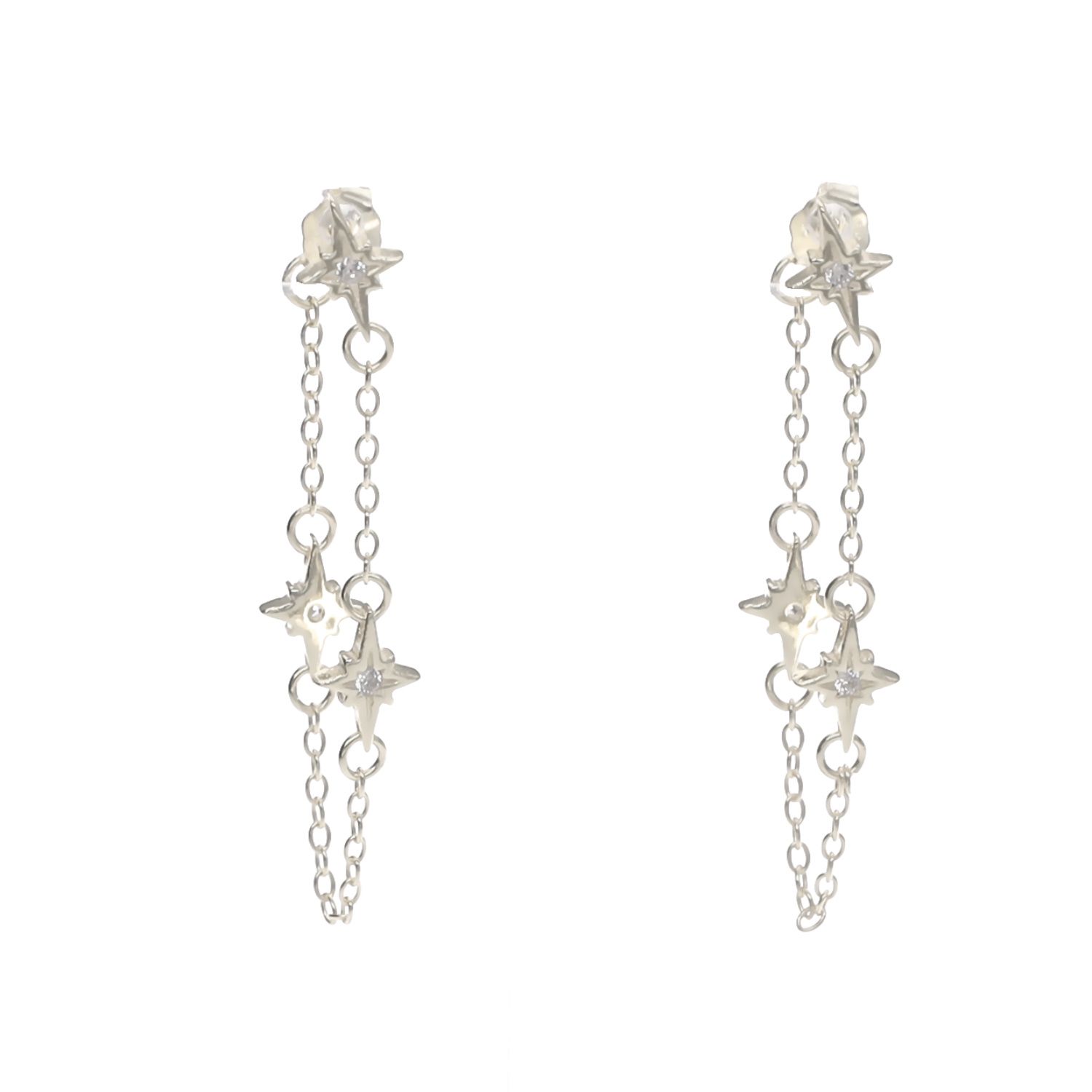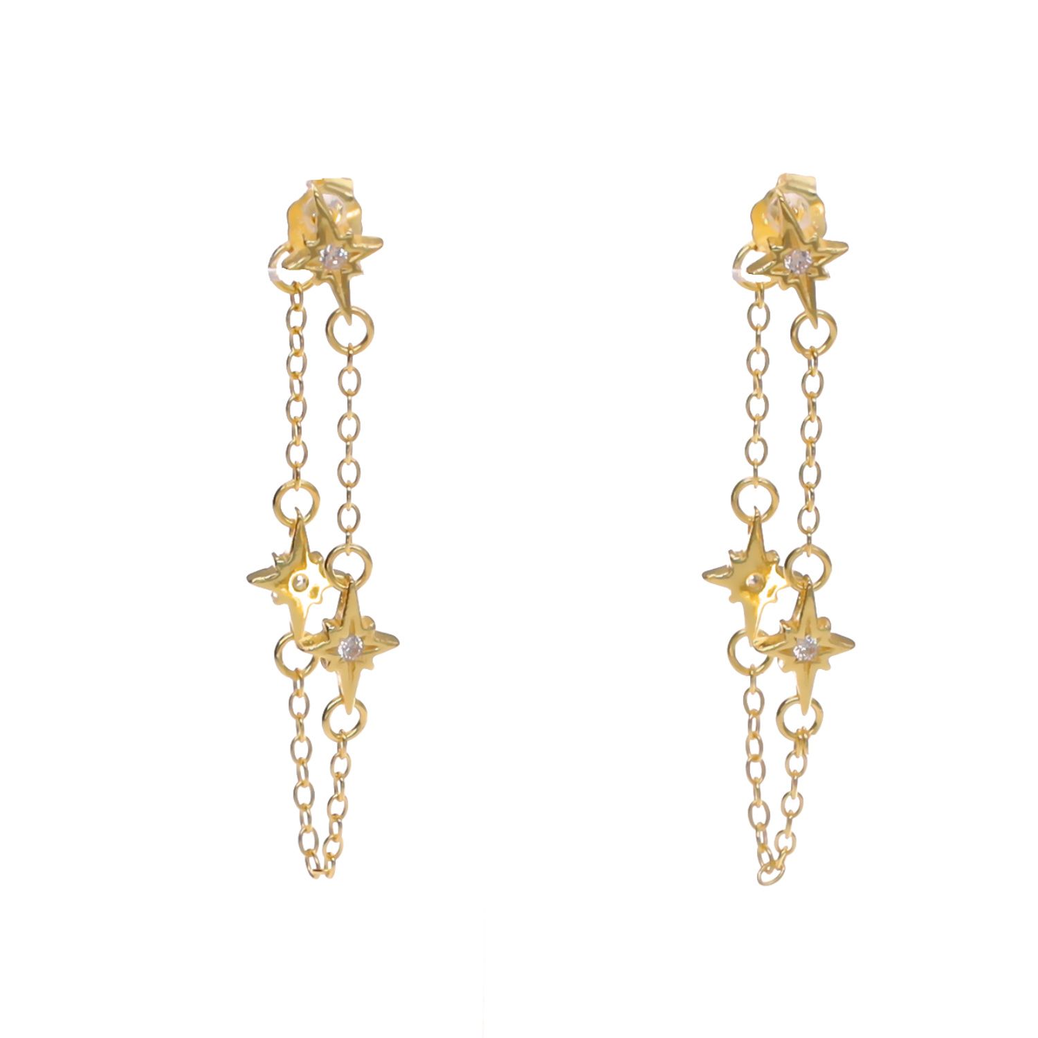 Boucles d'oreilles en argent 925 doré 3 microns, ornées d'une étoiles brillante et de deux plus petites sur la chaine qui relie également l'avant et l'arrière de l'oreille.