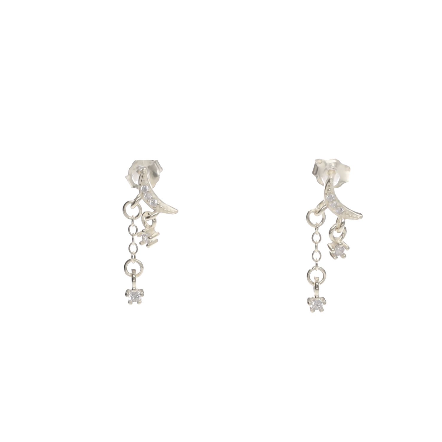 Boucles d'oreilles en argent 925, ornées de la lune brillante et de deux plus petits trass sur la chaine.