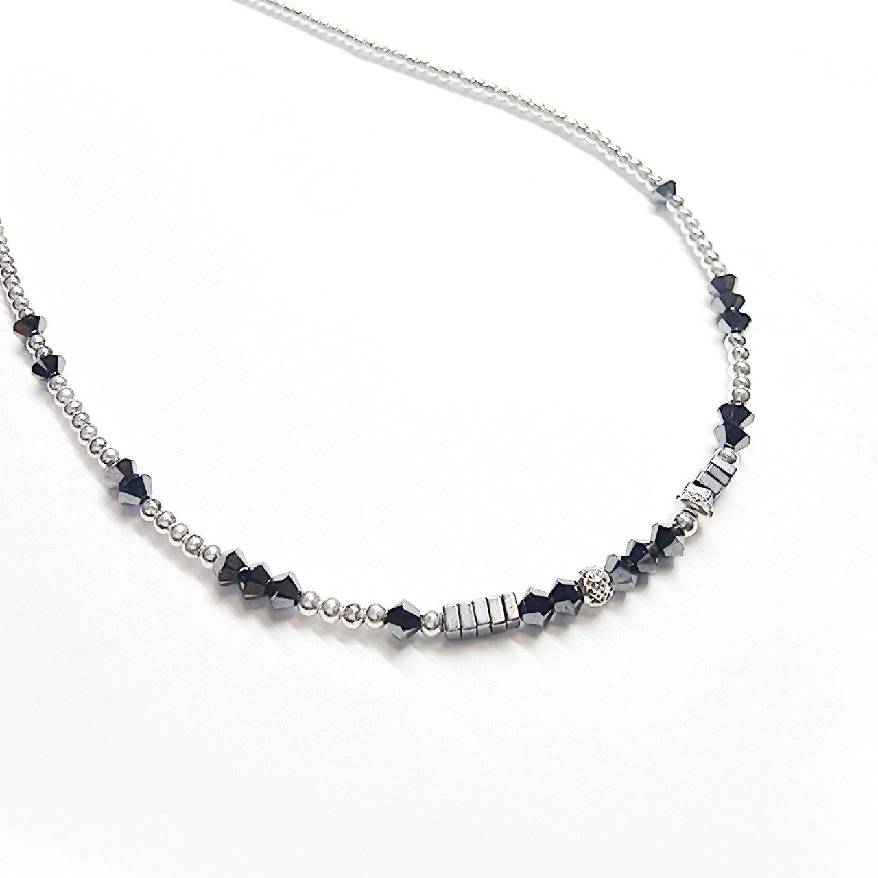 Il est composé de perles en argent 925, de cristaux qui lui donnent ce côté étincelant, et de petites rondelles en hématite.